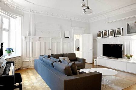 客廳的深色系沙發(fā),在一圈純白我墻壁突顯下顯得質(zhì)感十足