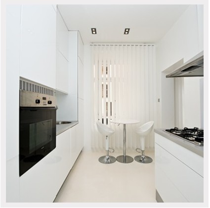 用射燈裝飾時(shí)尚廚房。在廚房中開(kāi)辟出一塊供兩人用餐的溫馨區(qū)域。