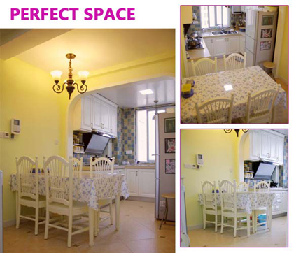 餐廳同廚房相連,廚房做成半開放形式,這樣既可以節(jié)省空間,又符合美式田園的設(shè)計風(fēng)格。小小的方形餐桌鋪上淡藍色的碎花桌墊,給餐廳增添了優(yōu)美寧靜同柔黃色的墻漆相互印。