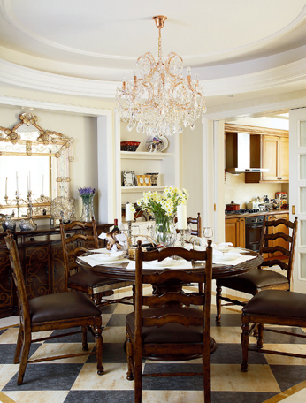 古典韻味十足的吊燈,別致的窗飾背景。在滿是實(shí)木餐桌椅的餐廳里顯得雍容華貴。硬硬的木頭在寒冷的冬天很多人都不喜歡,在美式風(fēng)格里,這樣的椅子會是皮質(zhì)的柔軟座墊。真的可以做到冬暖夏涼。