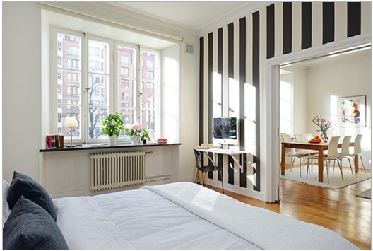 臥室,黑白間條設(shè)計(jì)占據(jù)了半個房間。白色的電腦桌色釘在墻上的,電腦就像沒有支撐地浮在半空中一樣。陽臺上的空間可以放書和綠色盆栽,豐富了以黑白為主的房間的色彩。