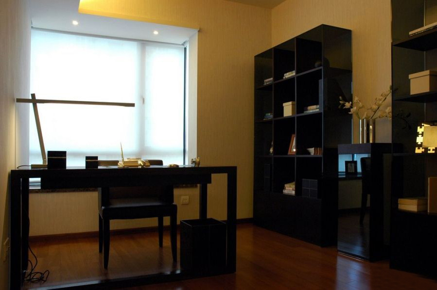 深色系的書房,穩(wěn)重,墻面的質(zhì)感是由暗紋造就的。