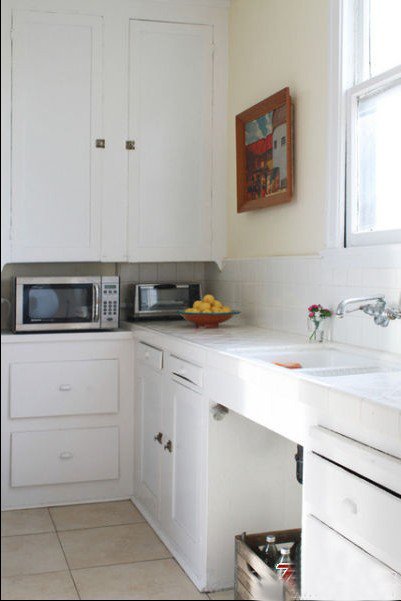 廚房里通體的白色調(diào),讓廚房間里幾乎看不到油煙的影子。