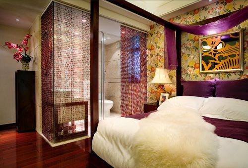 衛(wèi)浴間設(shè)計在臥室內(nèi),由玻璃和紫色珠簾隔開,白色的潔具與紫色珠簾的搭配看上去很美艷。純白和紫色的軟裝設(shè)計格調(diào),凸顯出臥室的迷人和優(yōu)雅,嫵媚的感覺洋溢其中。