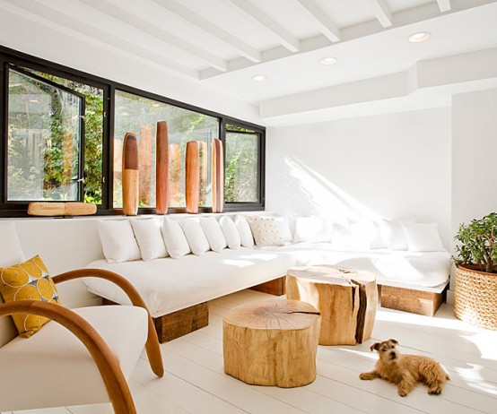 類似年輪的樹樁茶幾是空上簡(jiǎn)約客廳的一個(gè)特色,布藝沙發(fā),藤框盆栽……窗外的陽(yáng)光灑時(shí)客廳里,這樣的居家舒適自然。