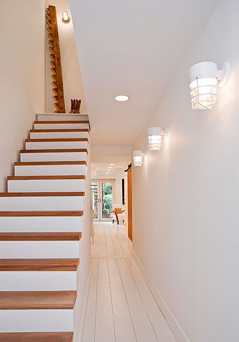 上樓的樓梯臺(tái)面依然用實(shí)木來(lái)做,赤腳走在上面也不會(huì)有水泥瓷磚的冰涼感。做這個(gè)樓梯之前,參考過很多其它復(fù)式躍層的樣子,但是都沒有找到合適的,最后還是自己決定另出新招吧。