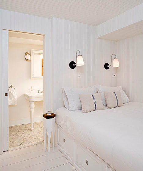 樓上的臥室配有小的衛(wèi)生間,空間不是很大,如果要做收納用,那么只有在床上下功夫了,整個(gè)床都變成鏤空的,一格格的收納出現(xiàn)。