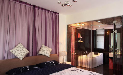 縱觀整個(gè)臥室,無(wú)論是紫色的簾子還是衛(wèi)浴間紅色的馬賽克,在色彩上皆與衛(wèi)生間純白的潔具與黑色背景墻相協(xié)調(diào)??瓷先ナ娣?、大氣,不失溫馨。