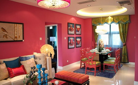 粉紅色給人以溫暖、放松的感覺,適宜在客廳里使用。如地板用柔和的粉紅色,然后在選用同色的布藝靠墊以及粉紅色印花的窗簾,在白色的沙發(fā)、米黃色墻的襯托下,再加點兒淡藍色,就會形成花壇般的羅曼蒂克格調(diào),頗適合年輕人的品位。