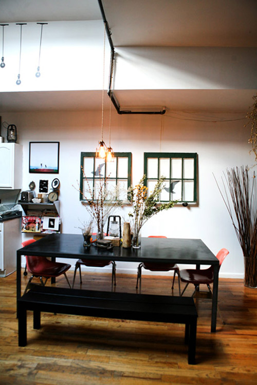 面積大一點的桌子可以招待來訪的親朋好友。垂下來的黃色燈泡搭配干花,一種英國田園的懷舊風格就出來了。綠色的假窗還有小鳥的貼紙,進一步增加了對大自然向往的氣息。