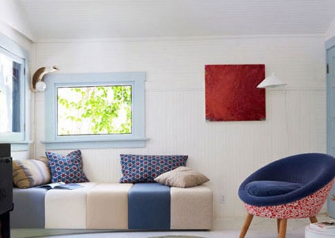 深藍(lán)、淺藍(lán)、天藍(lán),空間里不同程度的藍(lán)色調(diào)家具統(tǒng)一得有些執(zhí)著;而適量暖色系點(diǎn)綴的配飾,傳遞出一種溫暖與清新感。