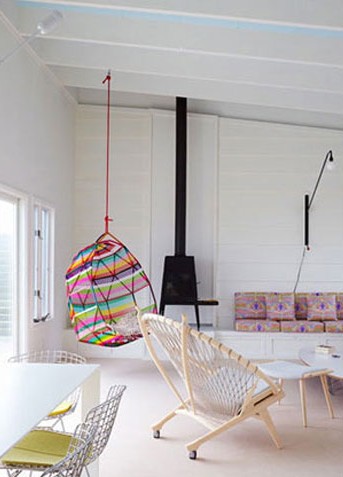 房間幾乎已全部被打通,使得各個(gè)空間之間有呼應(yīng)和交流。吊椅的顏色介于客廳和就餐區(qū)兩個(gè)色系之間的,巧妙地將兩個(gè)空間的色彩連接起來。