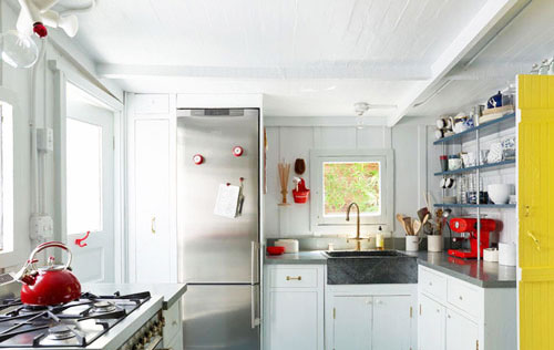 因整個(gè)公寓里的木材運(yùn)用已經(jīng)太多,不銹鋼材質(zhì)廚柜的輕靈起到了中和作用。廚房設(shè)計(jì)安裝了規(guī)整的墻面收納空間,不僅使用方便,更是別具個(gè)性和生活美感。