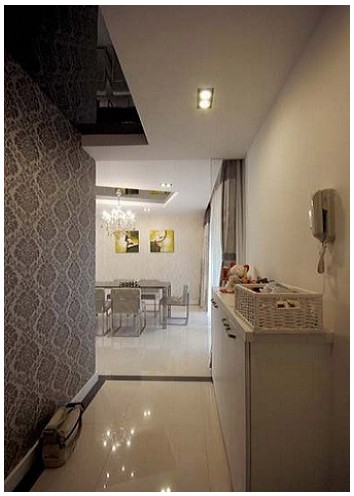 一個(gè)現(xiàn)代感極強(qiáng)的家居門廳,可以采用一些能表達(dá)時(shí)尚、前衛(wèi)的壁紙?jiān)氐?。白色的瓷磚與棕色的印花壁紙,會給空間帶來無限前衛(wèi)而又寫意的趣味。同時(shí),一個(gè)線面流暢的現(xiàn)代感十足的鞋柜,既滿足了門廳的功能需要,又與門廳的風(fēng)格極為協(xié)調(diào)匹配。