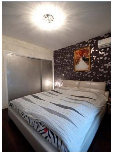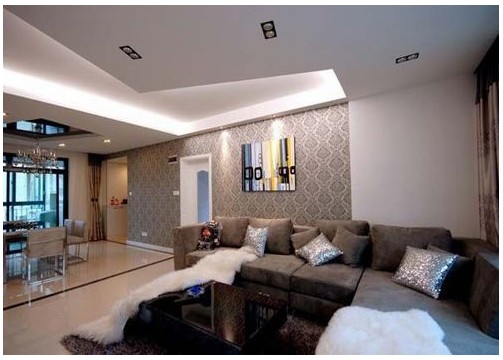 玄關(guān)處壁紙一直延伸到客廳沙發(fā)背景墻??蛷d棕色的沙發(fā)與墻紙色調(diào)一致。白色皮草及銀色靠枕,第一時(shí)間跳出大家的視線,有種小華麗的感覺。餐廳與客廳之間用了一圈玻化磚走邊,區(qū)分了客廳和餐廳的空間。