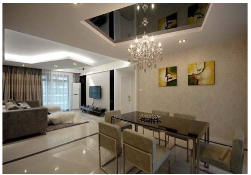 餐廳的全景,白色水晶吊燈與黑色烤漆吊頂?shù)慕^美搭配,貌似水晶燈猶如出淤泥的蓮花。很有質(zhì)感的黑色鏡面吊頂也可反射出兩個(gè)水晶燈,為餐廳區(qū)域增加了亮度。餐桌背景墻的兩幅黃色油畫,在棕色中起到點(diǎn)金之筆,使整個(gè)空間不那么沉悶。