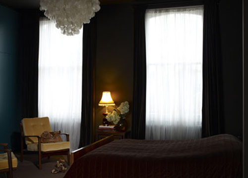 暗色調(diào)的臥室依然延續(xù)了家的整體風(fēng)格,夜間在微弱的燈光下奠定了安穩(wěn)的睡眠環(huán)境,同時(shí)也提升了房間的藝術(shù)美感。深色的窗簾與輕薄的白色窗紗搭配,給臥室空間帶來視覺變化增加了臥室里的層次感。