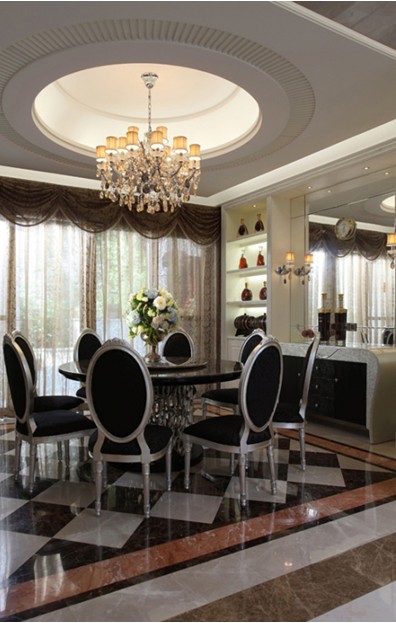 餐廳:以米黃色與白色系為主色調(diào)。餐廳天花與地面,則靈活使用圓形吊頂和菱形地面拼花,使空間充滿變化與趣味。