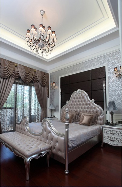 主臥:主臥大面積搭配銀色墻布,再間以近色的家具等,雍容大方,舒適奢華,突顯主人年輕時尚華貴的品味。而父母房、客房,兩種略顯厚重顏色搭配,亦是另外一種尊貴氣氛。