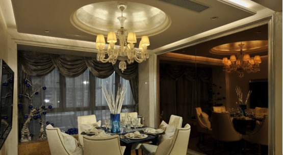 餐廳的軟裝部分與客廳相似,茶色鏡面同樣拉大空間的感覺,藍(lán)灰結(jié)合的裝飾品更加體現(xiàn)精致的美感。明亮暖色調(diào)吊燈與茶鏡的暗淡形成有趣的對(duì)比,散發(fā)溫情的情調(diào);