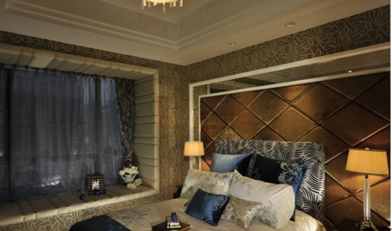 咖啡色的墻紙,床背景墻的咖啡色軟包,藍(lán)灰冷色調(diào)的軟裝,局部鏡面的折射都凸現(xiàn)低調(diào)的奢華。
