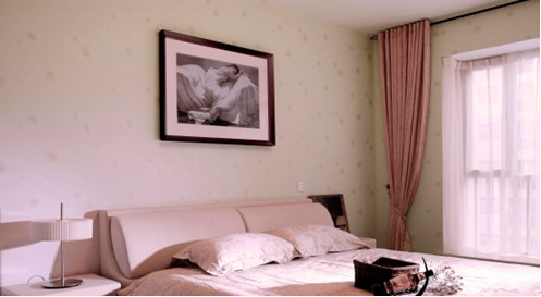 墻上大幅照片很好體現(xiàn)床寢文化意境,淡雅細(xì)碎的圖案墻紙、粉紅色的床上用品、粉紅色窗紗、桃紅色的窗簾,體現(xiàn)主人細(xì)膩性格;