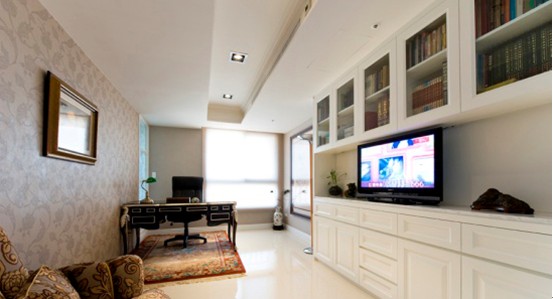 歐式中的白色家具是所有裝飾中比較洋氣的,也是比較討巧的裝飾,白色是神圣典雅的;白色大尺寸石膏頂角線條,局部白色吊頂燈帶,具有不對稱的美感;