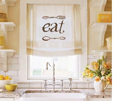 要加寬羅馬簾,首選剪些條紋布,長度相當于你實際裝飾的2倍(這里選的是20厘米長),對折熨燙長邊,然后折0.3厘米毛邊繼續(xù)熨燙。把燙好的毛邊粘到窗簾上,一頭粘正面,一頭粘背面,輕輕重合。用你喜歡的字體,每張紙印一個單詞。你可上網或到剪貼畫里找到銀餐具的圖案,并用復印機放大復印。把放大好的圖案放在窗簾下用鉛筆構出輪廓,按陰影輪廓以黑色布料馬克筆描好。將窗簾掛好并用大頭釘把裝飾固定在窗戶上。