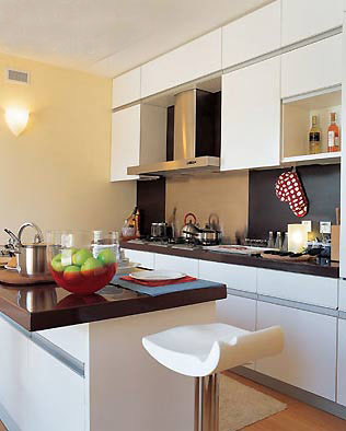 圖一中的廚房就是通過(guò)局部重色的點(diǎn)綴,然后配比大面積的淺色系地磚,讓居室空間看上去高挑但又不失重點(diǎn),葉國(guó)密說(shuō),開(kāi)放式廚房的頂面采用磨光的黑色石材,表面光滑如鏡,能夠反射居室光線,與高亮度地磚形成強(qiáng)烈對(duì)比,這種方式不僅可以在開(kāi)放式廚房中使用,對(duì)于小戶(hù)型的吊頂也不失為一種劍走偏鋒的方式。