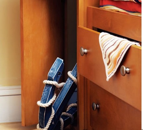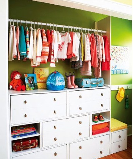 兒童房的衣柜可以擯棄傳統(tǒng)的顏色,粉刷些明快的顏色作為基調(diào)。這樣看上去更有開闊感又增加來儲物空間。這種組合式的柜體還可以根據(jù)收納需要調(diào)節(jié)抽屜和擱板的位置。低處設(shè)置了掛桿掛放衣物,下面的小柜子可以放鞋,背包或者帽子等外出用品則可以整齊地掛在掛鉤上。