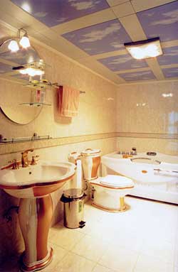 這款公寓型的衛(wèi)生間,在硬件上也提高了檔次,安裝了按摩浴缸、自動調(diào)溫水嘴、大理石面板的洗面化妝臺、電動吹風(fēng)器、剃須器。