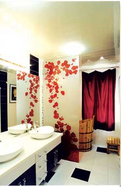 年輕職業(yè)女性希望衛(wèi)生間除具備使用功能外,還應(yīng)盡量浪漫一些。因此,為了演繹衛(wèi)生間的別樣浪漫,衛(wèi)生間不必過多地雕琢和堆砌。紅色和黑色是這里的主旋律,并用有花瓣圖案的彩繪玻璃分割衛(wèi)生間的干濕區(qū),既節(jié)約了空間又服務(wù)于裝飾,恰到好處。紫紅色的窗簾從墻壁上傾瀉而下,再次聚焦了我們的視線。木桶浴缸在精美玻璃隔斷的掩映下若隱若現(xiàn),小木凳在黑白瓷磚的襯托下也愈發(fā)質(zhì)樸而靈動。