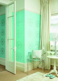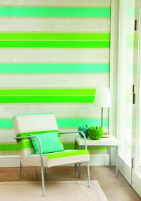 Pattern 4亮彩條紋 以一種由青綠色和淡黃綠色條紋組成的家居織物作為創(chuàng)意的來源,在墻上涂抹出相同的圖案,這種現(xiàn)代風格的嘗試,像是一匹放大的椅子包面,產(chǎn)生出奇妙的視覺幻象,適用于裝飾起居室,同時也適用于臥室。