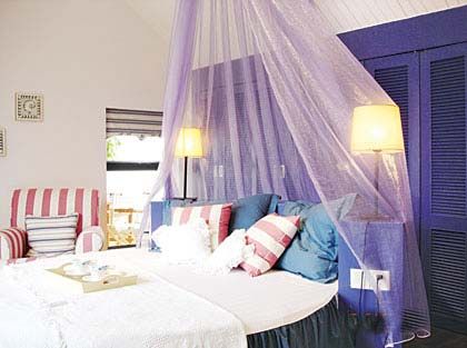 閣樓的房間以藍(lán)白相配的地中海色彩為主。藍(lán)白相配給人以一種干凈、浪漫的感覺,很能彰顯主人的品位。房間的棚頂用豎條的板材吊頂裝飾,這就從視覺上弱化了斜坡的不舒適感,使屋頂整齊劃一。在斜坡處打造了一個(gè)比整體臥室藍(lán)色稍深的衣柜,衣柜的顏色處理使得它在藍(lán)色調(diào)的床后面并不醒目,把衣柜隱蔽起來(lái)的同時(shí)更把斜坡處給隱藏起來(lái)了,整個(gè)臥室看起來(lái)更加清爽高雅。