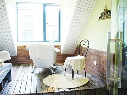 閣樓衛(wèi)浴間如果直接擺放浴缸,沐浴的時(shí)候看到頭頂?shù)男逼聲?huì)有種壓抑感。墊高后的浴缸正好正對(duì)著窗口,當(dāng)主人在享受洗浴帶來(lái)的舒適感的同時(shí),還可以順便看看外面的風(fēng)景。而相比較瓷磚和馬賽克,桑拿木的腳感更溫暖、更舒適,為整個(gè)衛(wèi)浴間增加了裝飾效果。
