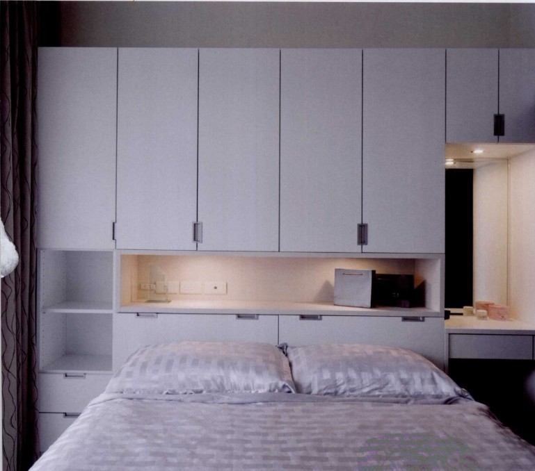 主臥空間有限,設(shè)計(jì)師利用床頭空間規(guī)劃床頭柜,并全都采用系統(tǒng)柜,左邊為展示型的收納柜,右邊是梳妝臺(tái)。特別選用霧面白色木紋門(mén)片,提升空間質(zhì)感。