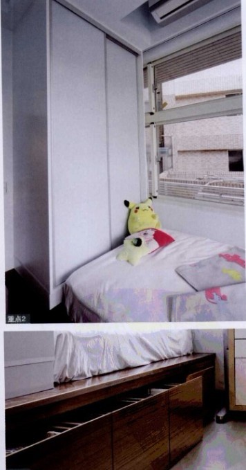 將臥室的地板架高,將衣柜延伸至天花板,突破系統(tǒng)柜尺寸限制,木地板下方則為抽屜式收納柜。