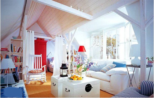 閣樓形式的客廳空間設計,到處用到了木條式結(jié)構裝飾。客廳別致的木箱茶幾,藍白色條紋沙發(fā)坐墊,藍與白的色彩搭配描繪出一片藍色的海洋,喜歡大海的人,一定會喜歡這樣的空間,置身其中像微風拂過,享受著室內(nèi)的恬靜與優(yōu)雅。