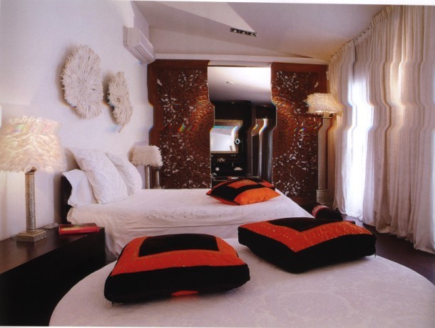 拿走臥室里幾個顏色鮮艷的靠墊,這個臥室里似乎少了一些生氣,過于空靈??臻g的主體陳設(shè)物采用白色作為主色調(diào),突出柔和、純潔的視覺感受,與其相搭配的靠墊和隔斷卻采用了鮮艷的色彩,以便形成一種色彩上的對比和反差,進(jìn)而給人們以視覺的刺激。