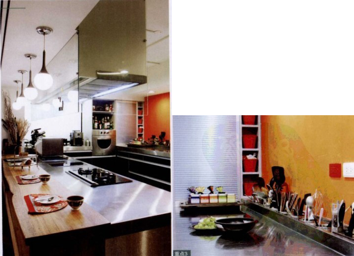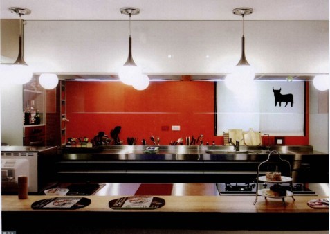 以日式居酒屋為概念設(shè)計(jì)的廚房吧臺(tái),讓屋主可以邊下廚連跟朋友聊天。考慮到廚具以不銹鋼為主,為化解冰冷感,特別以紅色來中紅。而廚房的電器,都以嵌入為主。