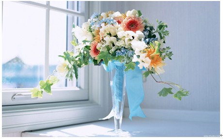 亮點二:貌似新娘的捧花放置窗前,鮮艷的花頭享受著陽光的洗禮,繽紛艷麗的鮮花使家居活力迅速升級,而飄逸的藍色絲帶使窗臺瞬間靈動起來。