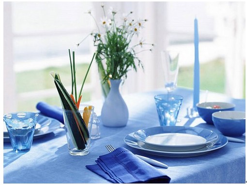 亮點一: 透亮的水晶玻璃杯與清涼的藍色餐具相互輝映,跳躍的亮色點綴著素雅沉靜的餐廳,立即讓餐廳區(qū)域變的生動起來。
