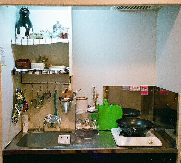 ?。停驼f,一個住的房子,不要空間太大,會覺得空曠,沒有安全感。小房子,都自己的手塞得滿滿的,反而更舒適。這個小廚房剛過1米5,卻是實用之極,油、鹽、醬、醋的瓶瓶罐罐擺放在各自應有的架子上,小廚具的擺放利用墻面的空間立掛在水池對面的墻上,在上面的則是定制的小木柜,可以存放碗具。為了防止白凈的墻面有油煙污染,特地在爐子邊的墻壁上置上這樣的不銹鋼面板,易清潔。