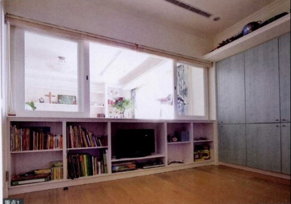 每個(gè)房子可能或多或少都會(huì)出現(xiàn)畸零空間,應(yīng)該多利用這些空間的使用。男孩房的柜體止方有梁柱,因此設(shè)計(jì)有層板,一來(lái)滿足收納功能,二來(lái)則可以遮蔽梁柱。
