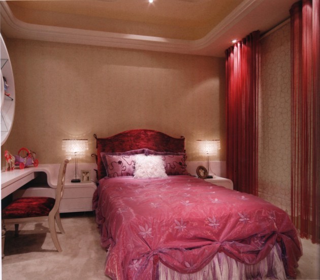 這個(gè)滿是浪漫情調(diào)的房間,它的情調(diào)是歸功于床上的裝飾品。用粉色的床單作為床的修飾元素,能夠表達(dá)出一種爛漫的情愫,就好似少女的情懷,讓人迷戀而又不可觸摸。顯然這個(gè)房間是女性的私密臥室。歐式的設(shè)計(jì)手法,暖色溫馨的色調(diào)成就臥室少女浪漫。