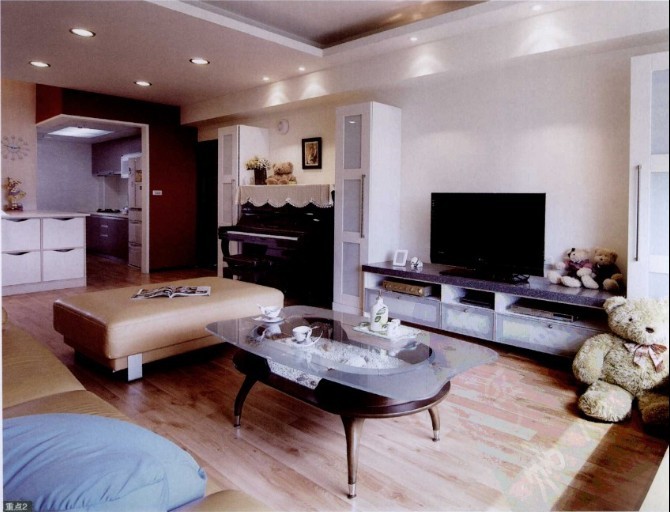 家里的GG喜歡讀書,而MM則是鋼琴愛好者。如何在客廳這個不大的空間里再融入鋼琴,又要做到與客廳互不打擾呢?設計師以三個長柜直接隔開,一邊擺放鋼琴、一邊作為電視柜,另一邊放置書柜,兼顧了GG與MM的共同需求也做到了美觀與使用的功能。