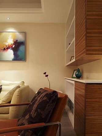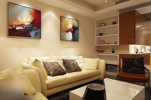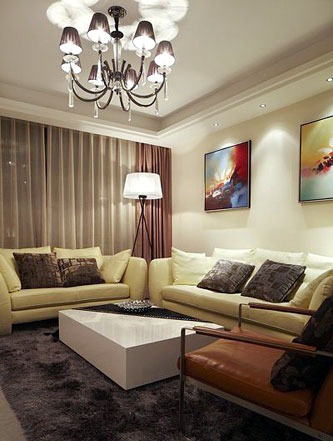 一進(jìn)房間,整個(gè)空間給人一種清爽不失高貴的感覺。客廳區(qū)域墻面沒有做過多的裝飾,墻面采用米黃色的油漆,客廳的吊頂也沒有做的太復(fù)雜只是在墻的邊角走了一圈邊,做成上下疊級(jí)的吊頂,并配上水晶吊燈,奶油色的布藝沙發(fā)搭配深色靠墊,既簡單又富有現(xiàn)代感。一個(gè)漂亮的落地?zé)粽樟琳麄€(gè)房間又起到了很好的裝飾做用,一舉兩得。沙發(fā)背景墻沒必要做的復(fù)雜,掛上兩幅簡單油畫,現(xiàn)代感極強(qiáng)。