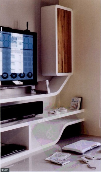喜歡視聽的業(yè)主,CD 、DVD片的數(shù)量絕對不會少。設(shè)計師在電視墻上規(guī)劃造型展示層架,不但收納功能不減,也兼顧了美感,而下方的開放柜則用來收納游戲機。