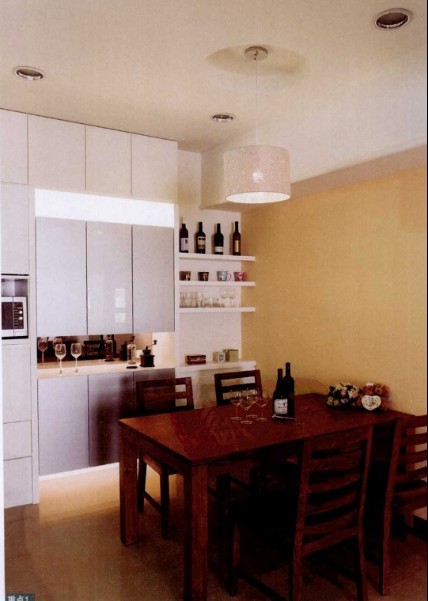 利用餐柜上、中、下及側(cè)面的燈光變化,可依心情調(diào)整氣氛。最左側(cè)的餐柜用來收納各式電器,需要時拉出,平時則隱藏起來,同時把柜體做到頂,充分利用收納空間。放置食物的柜子使用銀色烤漆,搭配木質(zhì)家具,讓空間更有變化。