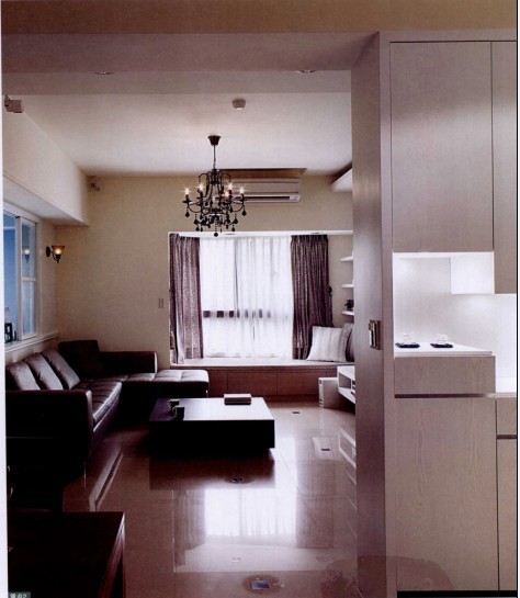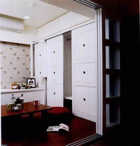 家居的裝修,業(yè)主希望符合“色彩、舒適、明亮、收納”這八字要求,所以設(shè)計師從一進門就規(guī)劃了白色木紋玄關(guān)鞋柜,同時以高低不同的設(shè)計調(diào)整出展示空間??蛷d懸吊柜及觀景沙發(fā)座同時滿足了視聽設(shè)備及生活雜物的收納。餐廳的收納則以餐廳為主,結(jié)合美感與功能的餐柜不僅讓電器及食物都有空間收納,還成為空間視覺焦點。設(shè)計師還特別設(shè)計了和室,室中窗前柜、落地柜、地板下的矮柜都具收納功能。